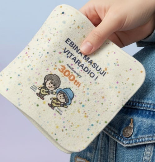 エビナマスジのラジオ番組『エビナマスジのビタラジ!』放送300回をお祝いするために特別にデザインされたミニハンカチタオルが登場しました!感謝の気持ちを込めたこのアイテムをお届けします☆
